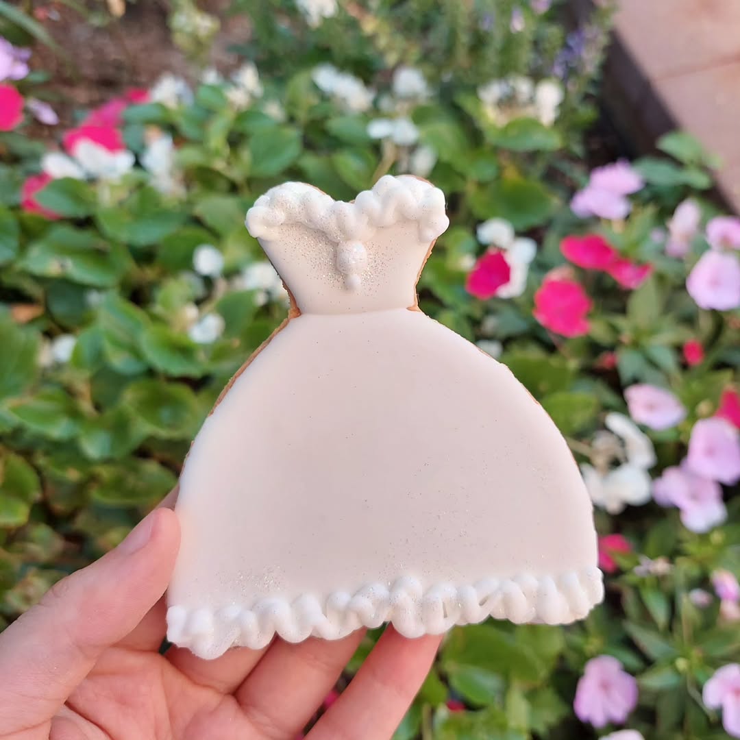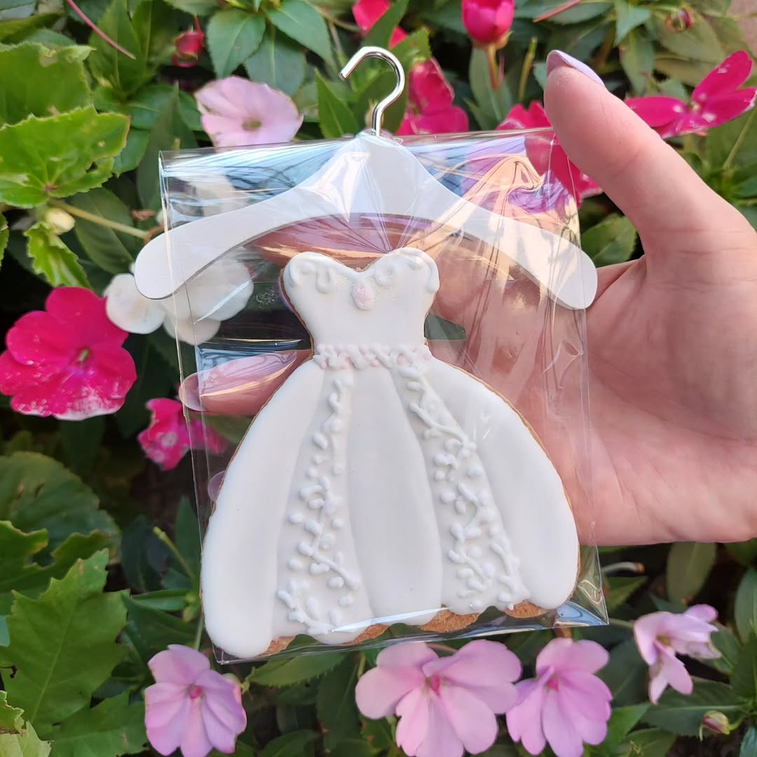 👰 Celebrate the joy of “I do” with our beautifully hand-decorated Wedding Dress cookies!